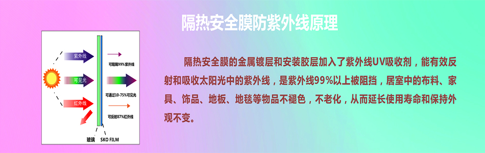 隔熱膜能很好阻隔太陽輻射中的紅外線熱量及紫外線,其中紫外線是造成室內(nèi)家居地板、家具、藝術(shù)品、窗簾等褪色老化的原因,又會引起皮膚癌,貼膜可阻擋80%紅外線熱量及99%以上的有害紫外線,給您提供舒心的呵護(hù)。